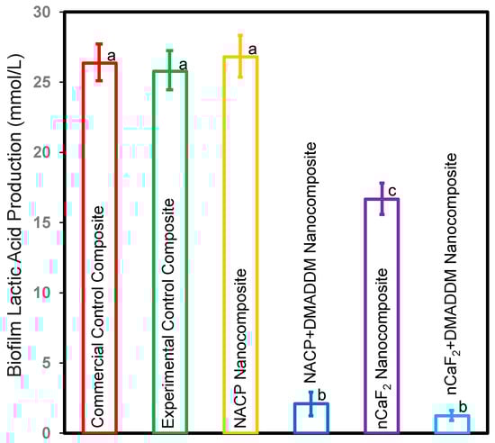 Lactic acid production of S. mutans biofilms on composites (mean ± sd; n = 6). The NACP nanocomposite and control composite groups had the highest lactic acid production (p < 0.05). The nCaF2 nanocomposite reduced lactic acid production compared to control groups (p < 0.05). However, incorporating DMADDM diminished lactic acid production by over 92% compared to other groups (p < 0.05). Different letters represent data that are significantly different from each other (p < 0.05).