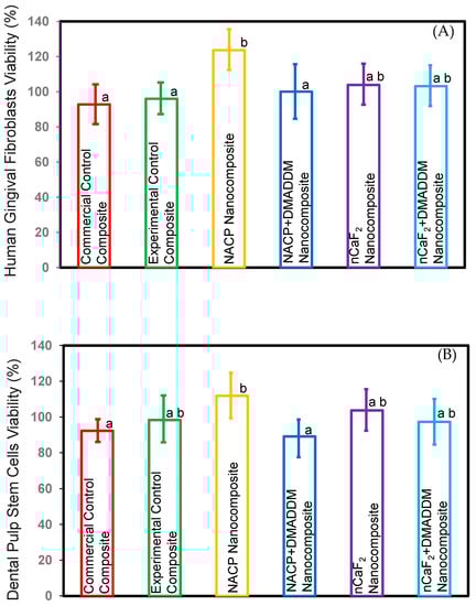Cell viability of composites. (A) HGF, (B) DPSCs (mean ± sd; n = 3 × 3). These results showed that the NACP nanocomposite had a significant increase in viability compared to the commercial control composite (p < 0.05). All the other novel nanocomposite groups showed comparable viability to commercial control composite (p > 0.05). Different letters represent data that are significantly different from each other (p < 0.05).
