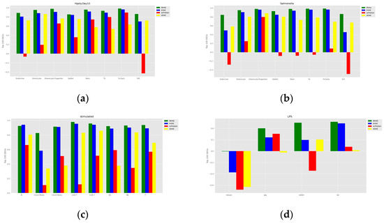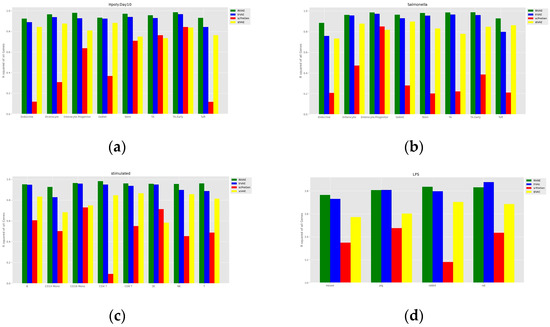 Comparisons of the R-squared value between the average expression level of the top 100 genes in the DEGs of the real perturbed cells and the average expression level of the top 100 genes in the DEGs of the predicted cells. (a) Comparison of H.poly results for the Haber dataset. (b) Comparison of Salmonella results for the Haber dataset. (c) Comparison of Kang dataset results. (d) Comparison of results on the LPS dataset.