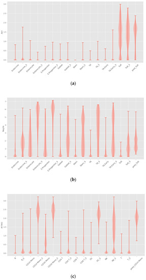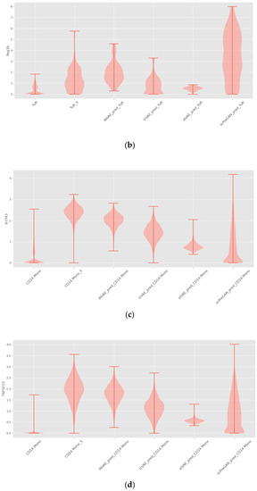 One of the reasons why deep learning methods have shown amazing performance in various fields is their ability to automatically capture nonlinear relationships in high-dimensional data. The four cellular response prediction methods presented here are based on deep learning models designed to exploit their ability to capture features of nonlinear gene–gene interactions to make accurate predictions. Among the four methods, INVAE can best capture gene–gene interaction features, resulting in the highest prediction accuracy, as shown above (see Figure 3 and Figure 4). We visualize the distribution of some selected genes to further demonstrate this question.
