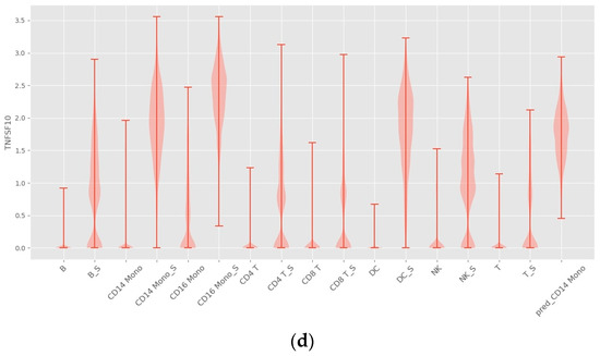 Violin plots with random sampling of the four model-predicted gene distributions and the true predicted gene distributions, cell names with the suffix “S” indicate perturbation conditions. (a) Violin plot of Avil in the Haber dataset. (b) Violin plot of Reg3b in the Haber dataset. (c) Violin plot of IFITM3 from the Kang dataset. (d) Violin plot of TNFSF10 from the Kang dataset.