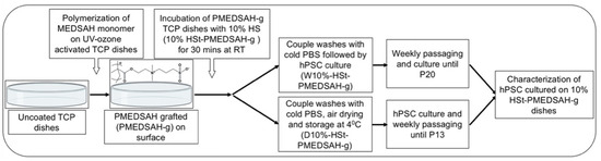 Schematic representation of the experimental protocol. PMEDSAH grafted (PMEDSAH-g) TCP dishes were synthesized using a surface-initiated graft polymerization procedure. The dishes were then pre-conditioned/treated with 10% human serum (HSt) (v/v DMEM/F12) and separated into two sets of 10% HSt-PMEDSAH-g dishes. The first set (W10% HSt-PMEDSAH-g) was used right after its preparation for culturing hPSC for 20 consecutive passages (wet-W). The other set (D10% HSt-PMEDSAH-g) was air dried and wrapped with parafilm, stored at 4 °C until their use for cell culture (dry-D), and used for the weekly passaging of hPSC for 13 consecutive passages. In both conditions, the cells were characterized for self-renewal and pluripotency.