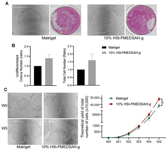 We quantified the hiPSC colonies developed on the Matrigel and W10% HSt-PMEDSAH-g dishes through AP staining and manually counting the colonies (Figure 5). Interestingly, the reprogramming efficiency was significantly higher (p < 0.0068) in the W10% HSt-PMEDSAH-g dishes compared to the control group—0.37% vs. 0.22%, respectively (Figure 5).