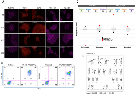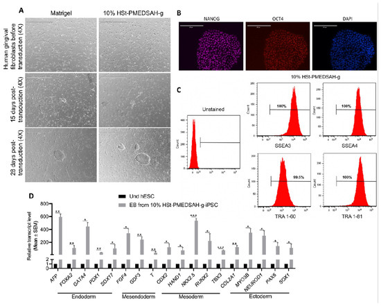 For iPSC reprogramming, 3 × 105 human gingival fibroblasts (hGF) were seeded on W10% HSt-PMEDSAH-g dishes in high-glucose DMEM supplemented with 10% HS (Sigma), 1% nonessential amino acids (NEAA) (Gibco Thermo Fisher Scientific), 1% GlutaMax (Gibco Life Technologies), and 1% penicillin-streptomycin (Gibco Life Technologies). When cell confluence reached about 50%, the Sendai viral vectors carrying KLF4, SOX2, OCT3/4, and c-MYC (CytoTune kit 2.0, Thermo Fisher Scientific) supplemented with 10 µg of hexadimethrine bromide (Polybrene; Sigma-Aldrich) were used for reprogramming into iPSC using the standard protocols [18]. Eight hours later, fresh medium was added. Seventy-two hours later, the cells were sub-cultured into a set of six dishes each for W10% HSt-PMEDSAH-g and Matrigel-coated, and then twenty-four hours later, the medium was replaced with StemFlex medium (Thermo Fisher Scientific) supplemented with 10 µM Y-27632 dihydrochloride (ROCK inhibitor) (Stem Cell Technologies, Vancouver, CA, USA). The hPSC culture medium with ROCK inhibitor was refreshed every day until week 3 or 4 until iPSC colonies appeared. The human iPSC colonies were analyzed by the alkaline phosphatase (AP) activity, and together with the colony morphology (well-defined borders and high nuclei per cytoplasmic ratio), were used to identify reprogrammed hiPSC colonies. The number of hiPSC colonies obtained on the W10% HSt-PMEDSAH-g dishes and Matrigel-coated dishes were quantified and used to calculate the respective reprogramming efficiency as follows: the number of hiPSC colonies in each group was divided by 3 × 105, which was the original number of fibroblasts plated for each group before reprogramming. In addition, the hiPSC were further characterized for self-renewal and pluripotency potential through immunostaining, flow cytometry, and qRT-PCR analysis.