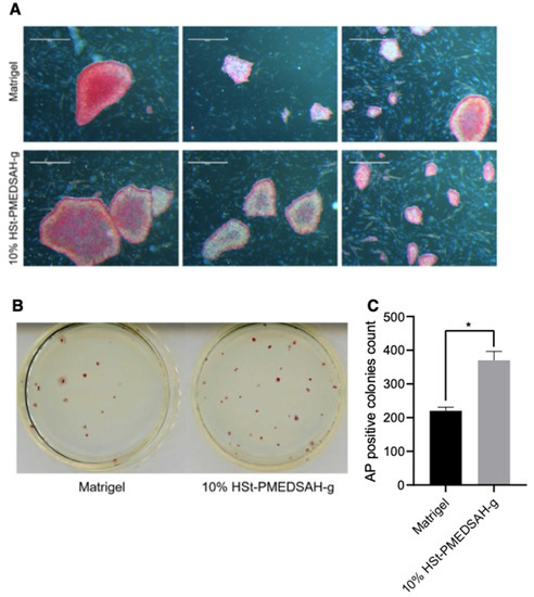 Improved reprogramming efficiency of human gingival fibroblasts into hiPSC on freshly prepared 10% HSt-PMEDSAH-g dishes.Human gingival fibroblasts were reprogrammed into iPSC on W10% HSt-PMEDSAH-g plates and Matrigel-coated plates. (A) Representative bright field images of iPSC colonies derived on W10% HSt-PMEDSAH-g and Matrigel-coated dishes after staining for alkaline phosphatase (AP). Scale bars, 5 mm. (B) Representative images of entire colonies in each condition and (C) graph indicating the average (N = 3) AP-positive colonies per culture dish in each condition. * p < 0.05, (n = 3; unpaired t test). Error bars in graphs represent the SEM of the group.