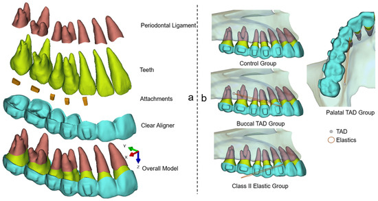 This retrospective study received ethical approval from the bioethics committee at the Peking University School and Hospital of Stomatology (No. PKUSSIRB-202059154). The FEM model employed in this study included teeth, the periodontal ligament (PDL), attachments, and CAs, as illustrated in