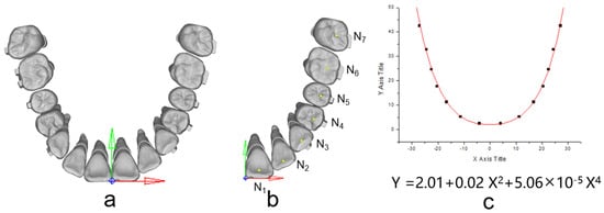 Figure 3b) and recorded to draw the arch form with the polynomial regression algorithm in Matlab, and fourth-order polynomials were selected for curve fitting according to a previous study [