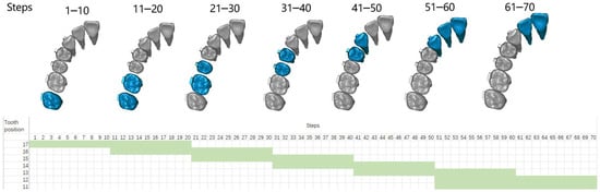 Figure 4). During the total 70 steps, for the movement of the canine to the second molar, 0.1 mm distal movement along the arch form was prescribed for the target teeth; for the movement of the incisors, 0.15 mm palatal movement was designed in each relevant step.