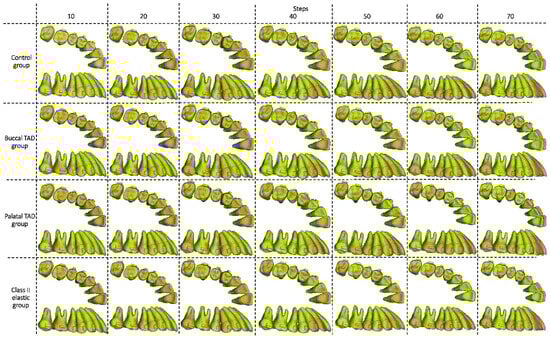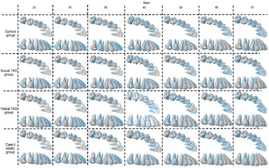 Figure 9). In steps 20–40 across all groups, undesired mesial tipping was observed in the already distally shifted second molars, with the greatest displacement occurring in the control group (0.89 mm) and movements ranging from 0.61 to 0.76 mm in the other groups. The largest uncontrolled labial tipping of the incisors was exhibited at step 50 in all groups. The palatal TAD group demonstrated the least labial inclination, accompanied by central incisor intrusion (6°, 1.21 mm), in contrast to the other groups (9.27–10.26°, 1.87–2.14 mm). During steps 50–70, incisors of all groups showed controlled palatal tipping.