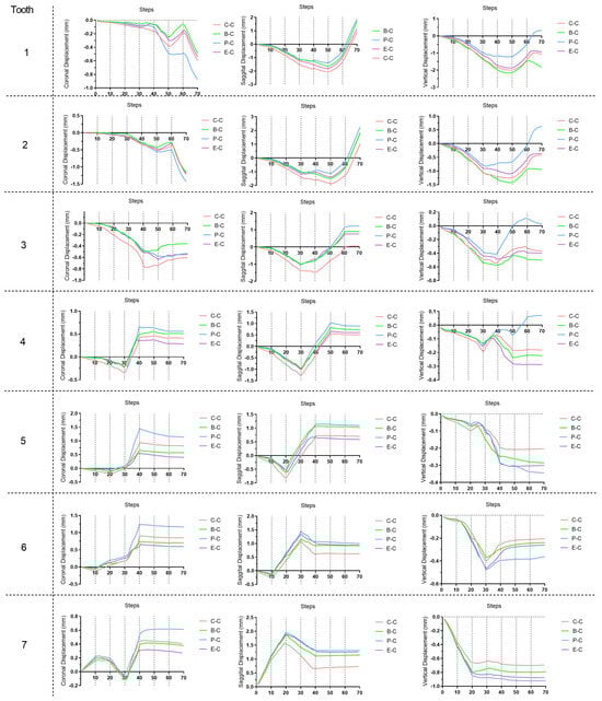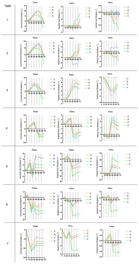 Figure 9). Theoretically, the largest anchorage requirement occurred in steps 10–20, during which both of the two molars were prescribed with distal movements. Indeed, obvious mesial controlled tipping of the premolars, uncontrolled mesial tipping of the canines, and uncontrolled labial tipping of the incisors were noticed during steps 10–20, with the most pronounced coronal axis rotation of the incisors displaced in the control group (3.63–4.05°) and the least rotation exhibited in the palatal TAD group (2.38–2.55°). In the initial 20 steps, all the distal movements of the first or second molars in all groups were recognized as uncontrolled tipping, and the displacement tendencies were similar (
