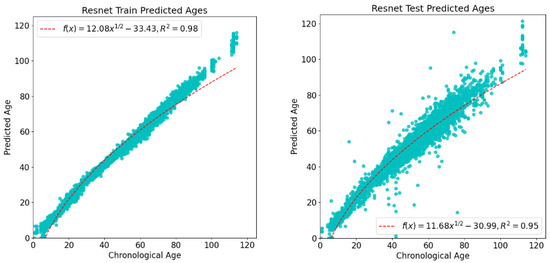 Model visualization metric results. The horizontal coordinates in the figure represent the actual age of the sample, and the vertical coordinates represent the model-predicted age. The left graph shows the prediction results of the model in the training data, and the right graph shows the prediction results of the model in the test data.