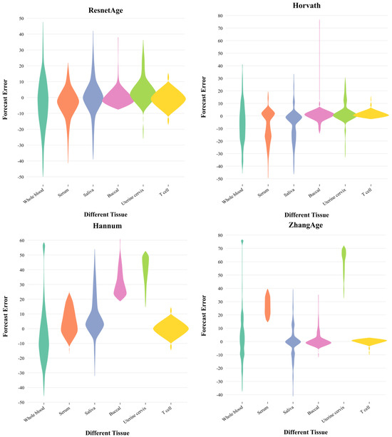 Prediction errors of different methods in six organizations. The four violin plots represent the methods of ResnetAge, Horvath, Hannum, and ZhangAge, respectively. The six colors in each figure represent the age prediction errors of six types of tissues: whole blood, serum, saliva, buccal, uterine cervix, and T cell. The age prediction error is calculated by subtracting the actual age from the predicted age. The width of the violin plot represents the data density of the prediction error. The wider part indicates that the data distribution is denser, and the narrower part indicates that the data distribution is sparse.