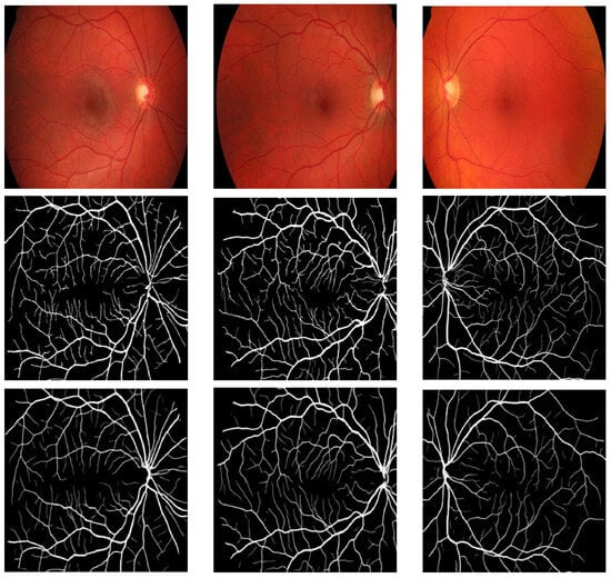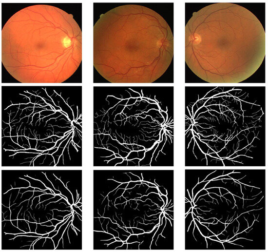 The ARIA (Automated Retinal Image Analysis) dataset comprises 143 fundus images annotated for blood vessel segmentation [38]. Each image has dimensions of 768 × 576 pixels and includes images of both left and right eyes. The dataset was gathered during the period 2004 to 2006 by St. Paul’s Eye Unit, Liverpool, UK, from male as well as female adults. It consists of three groups: the control group with 61 images, the diabetic retinopathy group with 59 images, and the age-related macular degeneration (AMD) group with 23 images. Two different graders, denoted as “SS” and “BD”, annotated the images, and the labels from grader “BD” were used in this experiment. Eighty percent of the data was used to train and the rest to test the model.