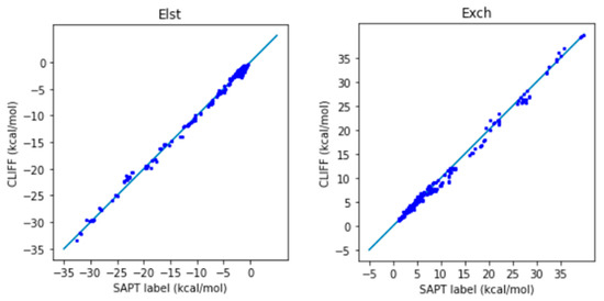 Recently, successful cases of utilizing these ML algorithms in macromolecular modeling, such as drug discovery, have been reported [62,63]. The purpose of molecular modeling is to well represent the noncovalent interactions (NCIs) involved in highly heterogeneous chemical, material, and biological environments [64,65,66]. These physical interactions are relatively weak as compared to usual chemical bonds but play a determining role in maintaining the equilibrium state of biomolecules such as lipids, proteins, and peptides in physiological conditions. The target object searched for in this kind of study is the unknown force functions for the NCIs, which are expected to be multidimensional. In this paper, we perform ML modeling on our previously constructed SOFG-31 and SOFG-31-heterodimer datasets. Our main purpose is to test a recently released ML algorithm called the CLIFF scheme [67]. In a previous study [68], we used a lower SAPT level of theory (SAPT0) to calculate the potential energy data and tested the ability of the CLIFF scheme to interpolate the datasets, with an emphasis on the possible overfitting problems. In this present paper, we would like to test the effect of changing the SAPT theory level on the predictive power and determine a minimum level of theory (SAPT2) for approaching the benchmark accuracy. The other parts of this paper are organized as follows: The main calculation results and due discussion are presented in Section 2. The dataset descriptions and methodological details are summarized in Section 3. The conclusions and perspectives are given in Section 4.