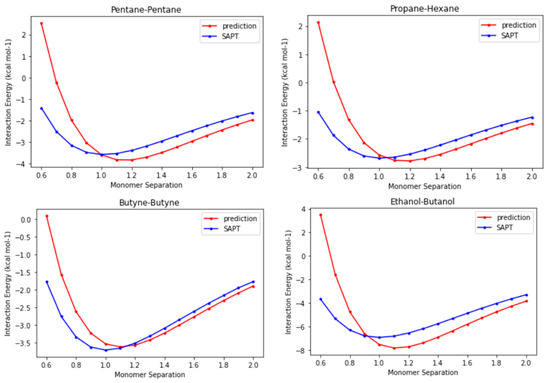 Comparison of the prediction energy curves with the destined SAPT energy curves for the pentane-pentane, the propane-hexane, the butyne-butyne, and the ethanol-butanol heterodimers. The monomer separation refers to the distance between the centers of mass of the involved monomers in the dimer and is normalized to the corresponding equilibrium distances, respectively.