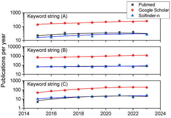 A closer look at the publication history of these study results in terms of trends can be appreciated in Figure 1. It compiles data on the yearly number of publications from 2015 to 2023 for keyword strings (A), (B), and (C) using the three literature databases here employed. While a look at former years (those previous to 2015 and since 2000) always shows a dramatic and exponential increment in publications for all the keyword combinations mentioned, even in the last eight years, there is a steady linear growth (in particular for combination C, which includes iPSC as a search term) or a high number of publications is maintained (in particular for combination B, reflecting research on RGCs and stem cells in general), highlighting the rising interest of scientists, physicians, and engineers.