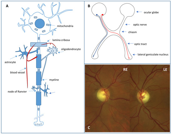 Retinal ganglion cell (RGC) loss is the hallmark of optic neuropathies, including glaucoma, where damage to RGC axons occurs at the level of the optic nerve head [16]. RGCs (Figure 2A) are located in the inner retina and act as bridging neurons between the retina and the visual processing centers of the central nervous system (CNS) by receiving electrical signals from the photoreceptors through bipolar cells [17]. There are at least 18 distinct types of RGCs that extract visual stimulus attributes, including spatial contrast, color, motion, fine and coarse details, and light level, before transmitting them to the CNS [17]. These signals are then conveyed via axons, which form the retinal fiber layer and project to the lateral geniculate nucleus through the optic nerve, chiasm, and optic tract, while preserving the retinotopic organization (Figure 2B). In addition, around 1% of RGCs have “non-visual” functions and are intrinsically photosensitive due to the expression of melanopsin. These cells project directly to other nervous structures, such as the suprachiasmatic hypothalamic nucleus (which regulates circadian rhythm) and the pretectal nucleus (which controls the pathway of pupillary reflexes) [17]. Around 1–1.2 million RGC axons exit the ocular globe through 200–300 connective tissue channels that form the scleral cribriform plate. The axons are unmyelinated and surrounded by abundant astrocytes in this laminar portion of the optic nerve. The vascular supply occurs through the arterial circle of Zinn–Haller, which is formed by the short posterior ciliary arteries that are terminal branches. The unique vascularization and peculiar architecture of this portion of the optic nerve play a relevant role in the etiology of some optic neuropathies, such as those of ischemic origin or glaucoma. In the retrolaminar portion of the optic nerve, the nerve fibers are myelinated due to the presence of oligodendrocytes and are also surrounded by meningeal linings.