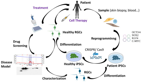 As it has been previously mentioned, RGC loss is the main hallmark of HON. For that reason, many research groups worldwide are working to find methodologies that can allow for the replacement of the damaged RGCs in these patients. However, human RGCs are difficult to access and grow in vitro [63]. Therefore, human pluripotent stem cells, which include human embryonic stem cells (hESCs) and human induced pluripotent stem cells (hiPSCs), represent one of the most promising sources of human RGCs. The discovery of iPSCs has marked a milestone in biomedical research. In 2006, adult murine fibroblasts were successfully reprogrammed into iPSCs by introducing the Yamanaka transcription factors (Oct3/4, Sox2, c-Myc, and Klf4) using retroviral vectors [64]. One year later, hiPSCs were reprogrammed from human adult fibroblasts also using retroviruses [65]. Although iPSCs generated using integrative methodologies can be used to perform basic studies, discover new drugs, and model diseases in vitro, non-integrative methods offer the significant advantage of potentially producing “safe” iPSCs and are thus considered to be more suitable for cell-based therapies [66]. For that reason, the use of non-integrative methods such as Sendai virus, among others, have increased greatly in the last years [67,68,69,70,71]. iPSCs have a morphology and growth behavior typical of ESCs and are also positively stained for typical markers of these cells. iPSCs offer major advantages, including less ethical problems, self-renewability, and pluripotency, which provides them the capacity to potentially differentiate into patient-specific cell types such as RGCs [72]. Cells derived from iPSCs can also be used in regenerative medicine through a variety of approaches including autologous therapies and novel methodologies to edit genomic DNA at a precise locus in iPSCs (e.g., the CRISPR/Cas9 system) [72]. The availability and rapid evolution of this technology has made iPSCs a very promising tool for the generation of patient-specific cellular models and so-called personalized medicine [4]. Patient-derived iPSCs would much better reproduce the specific characteristics of the disease by additionally taking into account the patient’s own genetic background. In this way, iPSCs have enormous utility in helping to understand the interplay between genotype, phenotype, and the response to drugs or potential treatments [4]. Furthermore, iPSCs derived from healthy donors or iPSCs edited with the CRISPR/Cas9 tool could also be an excellent option for cell therapy applications [4,73] (Figure 3).