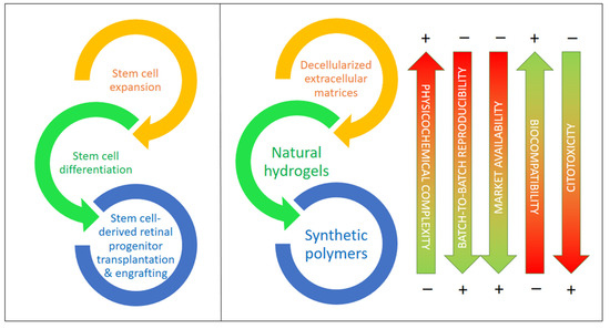 According to recent studies, supporting materials and carriers would help in the procurement, transplantation, and adaptation of differentiated cells created from iPSCs and other stem cells by providing physical and chemical cues that guide the differentiation of these and other stem cells and stabilize the target cell types, for example, against oxidations due to reactive oxygen species (ROS), which result in apoptosis in most cases [81]. In the last few years, there has been increasing evidence reported on the importance of decellularized extracellular matrix (dEMC) biomaterials, synthetic polymers, and natural hydrogels based on polysaccharides and/or proteins, either alone or in combination with very active small molecules. These biomaterials are key to the protection of stem cells (iPSCs in particular), helping in their expansion, differentiation to RGCs, and, ultimately, in their successful transplantation into the retinal space [85,86]. Figure 4 compiles the main types of biomaterials employed for the expansion, differentiation, transplantation, and engrafting of stem cells, together with a visual assessment of their main advantages and drawbacks.