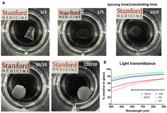 Optimization of spinning time and crosslinking time based on thickness and transparency of the gelNF membrane. (A) Macroscopic image of gelNF membrane under varied spinning and crosslinking times. The numbers on the top right of the image represent spinning time on the left of the slash and crosslinking time on the right of the slash. The number in the top right corner indicates spinning time/GA crosslinking time. (B) Transparency measurements of gelNF membranes made with different spinning and crosslinking times as a function of wavelength.