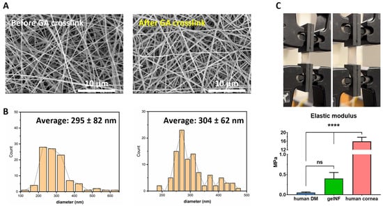 Analysis of nanofiber diameter and mechanical properties of gelNF membrane. (A) SEM images of the gelNF membrane before/after GA crosslinking and (B) calculation of the nanofiber diameter. (C) Tensile stress test of gelNF membrane and calculated elastic modulus, elongation at break, and ultimate tensile strength. ns = no significant differences and **** = significant differences.
