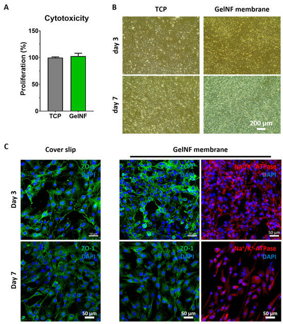IhCEC culture on top of the gelNF membrane. (A) Cytotoxicity of the gelNF membrane relative to the TCP and (B) comparison of the morphology and cell density of the IhCECs cultured on TCP and the gelNF membrane on days 3 and 7. Scale bar: 200 µm. (C) Immunofluorescence staining of tight junction proteins (ZO-1), pump protein (Na+/K+-ATPase), and nuclei (DAPI) of the IhCECs on days 3 and 7. Scale bars: 50 µm.