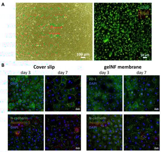 PrCEC culture on top of the gelNF membrane. (A) Morphology and Live & Dead staining of the PrCECs cultured on top of the gelNF membrane on day 1. Scale bar in phase-contrast image: 100 µm, and for the Live & Dead staining: 50 µm. (B) Immunofluorescence staining of the junctional proteins (ZO-1 and N-cadherin), water pump ion (aquaporin-1), and nuclei (DAPI) on days 3 and 7. Scale bars: 50 µm.
