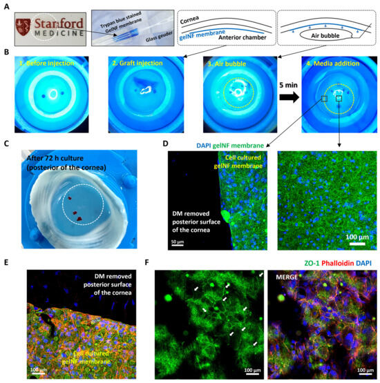 Lastly, an ex vivo study was conducted to evaluate the practical application of the CEC-cultured gelNF membrane. The artificial anterior chamber, considered an excellent tool for DMEK surgery wet labs [29,30], was utilized in this experiment to assess the material prior to transplantation in an animal model. Grafts inserted into the anterior chamber through a glass Geuder cannula were affixed to the posterior of the cornea using an air bubble for only 5 min (Figure 6B). This attachment occurred much faster than the several hours or days of gas bubble use with supine positioning in current DMEK procedures [31]. While the reasons for this relatively rapid adhesion are not fully known, it is likely a result of the high surface contact area as a result of the mesh-like surface topology of the gelatin nanofibers. While further work is merited to investigate this phenomenon in live animals (and patients), this potentially reduced adhesion time presents the advantages of reduced patient discomfort with strict supine positioning in the post-operative period and eliminating the need for re-bubbling procedures. Subsequent examination of the cytoskeleton (phalloidin) and tight junction protein expression in CECs post-transplantation revealed sustained expression for three days when in contact with both the gelNF membrane and the cornea (Figure 6E,F). Despite the autofluorescence of the gelNF membrane, the clear visualization of ZO-1 expression was aided by employing partial z-stack imaging to confirm tight junction protein formation (Figure 6F, white arrows). In this study, an engraftment test was conducted using rabbit corneas over a period of three days. As validated in the author’s prior research [32], it was observed that corneal endothelial cells migrated to decellularized cornea within three days of cultivation. Consequently, it is anticipated that during the degradation period of the membrane, there is ample time for corneal endothelial cells to migrate to the cornea. To validate this accurately, the transplantation results need confirmation via subsequent studies. However, considering that the membrane adhered to the cornea during the washing and fixation processes after three days of cultivation, it is believed that interactions may have occurred between cells and corneal tissue or between the gelNF membrane and corneal tissue.