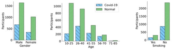 - Brown, C.; Chauhan, J.; Grammenos, A.; Han, J.; Hasthanasombat, A.; Spathis, D.; Xia, T.; Cicuta, P.; Mascolo, C. Exploring automatic diagnosis of COVID-19 from crowdsourced respiratory sound data. In Proceedings of the 26th ACM SIGKDD International Conference on Knowledge Discovery & Data Mining, Online, 23–27 August 2020; pp. 3474–3484. [Google Scholar]