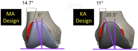 One limitation of this modeling study is that it did not determine whether morphological differences between KA and MA designs are large enough to be clinically important. However, a recent radiographic study [22] using the same KA design as that used herein showed that the line of action of the rectus femoris muscle, which is the preferred line to define the Q-angle [29], was medial to the 20.5° angle of the trochlear groove in all patients. When the line of action of the rectus femoris muscle is lateral to the angle of the trochlear groove, which occurred frequently with the MA design where the groove angle was 6° [22], the patella is medialized, thus increasing the risk of patellofemoral complications. This heightens the interest in future clinical studies which compare outcomes between the KA and MA designs.