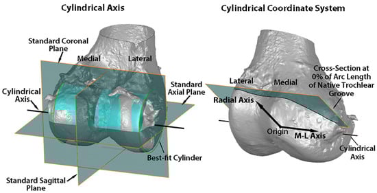 Images showing the standard planes and the relationship of the cylindrical axis with respect to the standard planes on a posterior oblique view of the 3D femur-cartilage model (left), and the origin, medial-lateral (M-L) axis, radial axis, and reference plane of the cylindrical coordinate system on an anterior oblique view of the 3D femur-cartilage model (right). The cylindrical axis (black line) passes through the center of a cylinder (green) best-fit to the central third of the cartilage on each femoral condyle (left). The origin of the cylindrical coordinate system was on the M-L axis (i.e., cylindrical axis) midway between the most medial and lateral points on the femoral condyles (right). A radial axis set at the proximal edge of the groove of the native trochlea defined the plane of the 0% cross-section along the arc length of the native trochlear groove. The relationship of the cylindrical axis and coordinate system to the prosthetic trochlea is not shown.