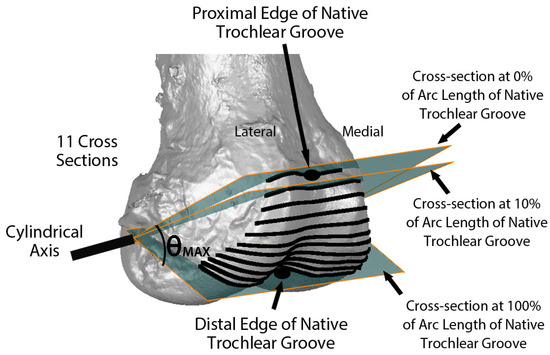 Image showing the relationship of eleven cross-sections along the arc length of the native trochlear groove with respect to the cylindrical axis on an oblique view of the 3D femur-cartilage model. The 0% cross-section was set coincident to the proximal edge of the trochlear groove, and the 100% cross-section was set at the most distal edge. Not shown are the projections of the cross-sections on the KA and MA prosthetic trochleas.