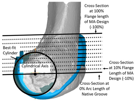 Additional cross-sections in planes parallel to the plane of the cross-section at 0% of arc length were used to describe the geometry of the anterior flange, which extends above the proximal edge of the groove. The −100% cross-section of the anterior flange corresponded to the most proximal point of the MA design. Although cross-sections in −10% increments are shown, analysis was performed only at cross-sections in −20% increments.