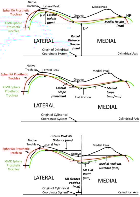 Diagrams of a representative cross-section of the distal femur showing the relationship between tracings of the articular surface of the native trochlea (black), the prosthetic trochlea for the MA design (green), and the prosthetic trochlea for the KA design (red). (Top) The landmarks of the deepest point (DP) of the groove and the highest point (HP) of the medial and lateral facets (only shown on the prosthetic trochlea for the MA design) were used to determine height variables, which included the radial distance of the groove and the heights of the medial and lateral peaks. (Middle) Medial and lateral slopes were tangents to the cross-section profile in the regions nearest the DP. (Bottom) Medial-lateral (ML) variables included the ML position of the groove, the ML flat width, and the medial and lateral peak ML distances from the DP.