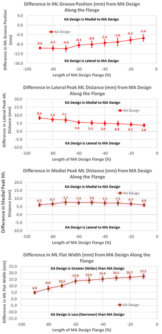 The groove in the KA design was considerably more lateral than the MA design by 10 mm, proximally decreasing to about 5 mm distally over the length of the flange (Figure 6) (p < 0.0001). Differences in the ML distance of the lateral peaks from the MA design started at about 8 mm medial, proximally decreasing to about 4 mm distally (p < 0.0001). Considering that the magnitudes of the lateral differences of the groove were greater than the magnitudes of the medial differences in the lateral peaks, the absolute positions of the lateral peaks were shifted laterally about 2 mm relative to the lateral peaks of the MA design. Likewise, since the groove position of the KA design was shifted laterally and the medial peak was shifted medially, the net shift was about 4 mm lateral in the absolute position of the medial peak, proximally decreasing to 0 mm distally. Finally, the flat width of the KA design was considerably wider than the MA design, ranging from 5 mm proximally to 17 mm distally (p < 0.0001).
