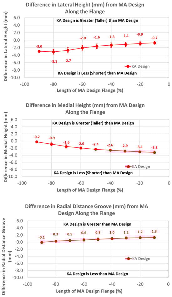 Graphs showing the mean ± one standard deviation for differences in lateral and medial heights and the radial distance between the KA and MA designs along the anterior flange at intervals from −100% (proximal) to 0% (distal) of the normalized length of the flange of the MA design.