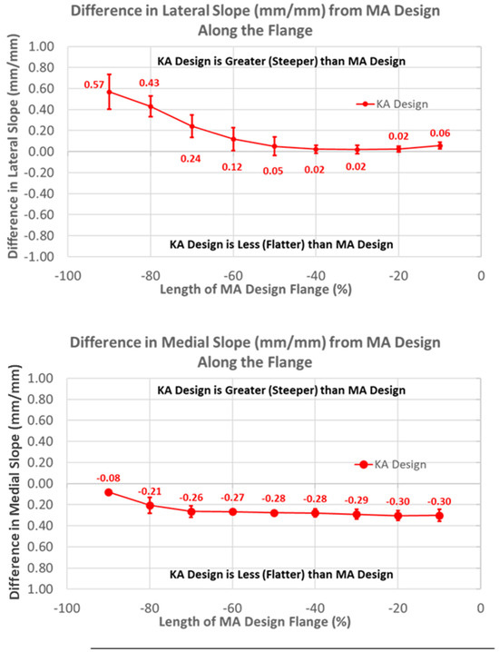 Likewise, patterns of slope variables for the KA design patterns differed from the MA design for lateral versus medial slopes (Figure 8). The lateral slope was steeper proximally by 0.57 mm/mm (p < 0.0001) and steadily decreased, becoming equal to the MA design at −40% flange height (p = 1.0000), whereas the medial slope was less than the MA design over the full flange height (p < 0.0001).