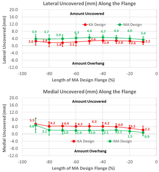 Graphs showing the mean ± one standard deviation of the coverage of the lateral and medial regions of the anterior resection for the KA and MA designs along the anterior flange at intervals from −100% (proximal) to 0% (distal) of the normalized length of the flange of the MA design.