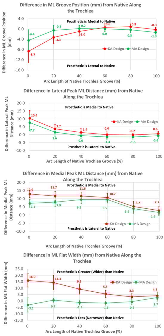 Graphs showing the mean ± one standard deviation for differences in medial-lateral variables between the native knee and the KA and MA designs along the native trochlear groove at intervals from 0% to 100% of normalized length of the native groove.