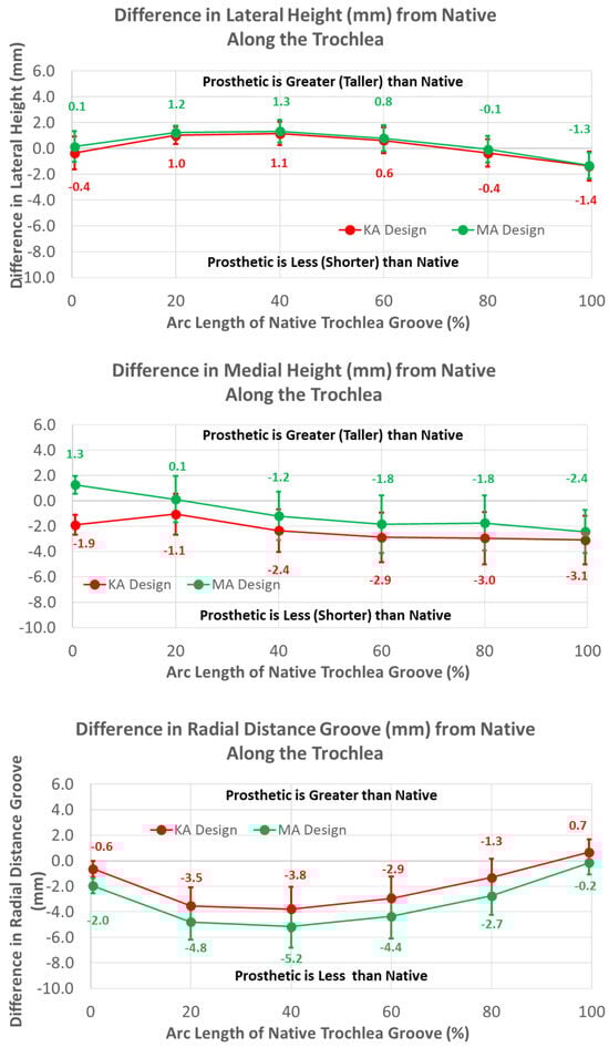 Graphs showing the mean ± one standard deviation for differences in medial and lateral heights and the radial distance between the native knee and the KA and MA designs along the native trochlear groove at intervals from 0% to 100% of normalized length of the native groove.