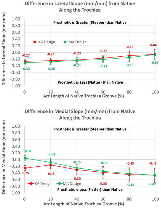 Graphs showing the mean ± one standard deviation for differences in lateral and medial slopes between the native knee and the KA and MA designs along the native trochlear groove at intervals from 0% to 100% of normalized length of the native groove.