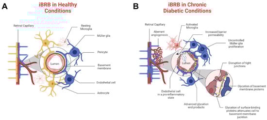Diabetic retinopathy is a progressive disease that becomes proliferative diabetic retinopathy (PDR) in its most severe stage and produces alarming health disparities in the vision loss of mature adults []. Retinal hemorrhage and thrombosis are a consequence of diabetes and a hallmark of progression to PDR []. Hyperglycemia and AGEs stimulate abnormal angiogenesis that primarily disrupts the inner blood–retinal barrier (iBRB), a selective neurovascular tissue that regulates the transport of molecules across microcapillaries and the neural retina. A healthy iBRB comprises endothelial cells, pericytes, Müller glia, and astrocytes, as shown in Figure 1A. By contrast, pathological tissue is represented by Figure 1B, where chronic environments of AGEs cause overwhelming pericyte death, activation of microglia, and severe astrogliosis []. As shown, molecular transport in PDR can be strongly regulated through endothelial cell and Müller glia communication, whose cell to cell signaling remains vastly understudied. Moreover, pathogenic iBRB is likely further compromised by the presence of retinal thrombi [] that can impact both barrier integrity and molecular transport across it. The influences of chronic AGEs on pathological responses are incompletely understood, despite the potential to advance the development of therapies for adult tissue.