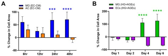 The experiments first measured changes in adhered surface area when cells were exposed to the secretome of other cells in their medium. Figure 2A illustrates the percentage change in surface area for Müller glia (MG) and astrocytes (AC) when cultured in endothelial cell (EC)-conditioned medium. MG were seen to increase in surface area by up to 50% when cultured in EC-conditioned medium. By contrast, AC responded to EC-conditioned medium with a decreasing cell area, which became smaller than the control over the experimental time period. These different phenotypical changes of retinal glia, in vitro, are consistent with their respective functions, in vivo. MG span the neural retina to provide trophic support between retinal neurons, regulate uptake of neurotransmitters, control the volume and water content of the retinal extracellular space, and remove waste to maintain the pH (rev in [,]). Significantly, MG also regulate the redox signaling needed for phototransduction, which leads to the exceptionally high metabolic rate of retina and its elevated consumption of glucose. In this role, MG manage the production of reactive oxygen species that can damage cell structures and work intimately with the retinal vasculature to safeguard the retinal supply of oxygen and nutrients [,]. In complement, AC are the predominant neuroglia of the blood–brain barrier (BBB), where the cells control the ionic and water balance, as well as regulate the composition of extracellular brain fluid, interactions with immune cells, and synaptic functions (Rev in []). However, while MG reside within the neural retina, AC cell bodies are located upon the nerve fiber layer of healthy retina and extend only their cell processes within the neural retina []. Surprisingly, many barrier models include only AC to study the role of glia in different neurovascular barriers [,]. However, PDR patients often undergo vitrectomy to remove scarred tissue made of reactive astrocytes upon the nerve fiber layer [], leaving pathogenic iBRB with strongly diminished numbers of AC and, consequently, stronger reliance on interactions between MG and EC. These differences in glial phenotypic observations in vitro echo significant differences in AC and MG functions in healthy and degenerated retina. Further studies will identify the cytokine composition of conditioned media to establish a more direct relationship between cell area changes and cytokine expression. The data highlight the benefits of controlled in vitro study to aid the development of therapies by examining cell–cell relationships in chronic pathogenic states.