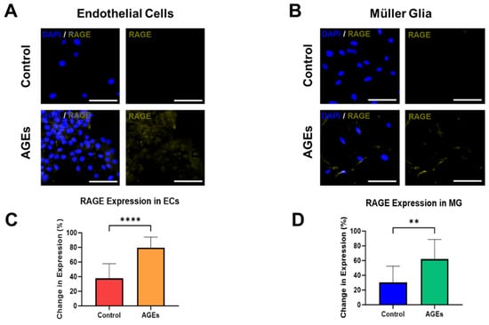 The final experiments measured the expression of RAGE, the receptor for AGEs, within EC and MG, in both the control medium and medium spiked with AGEs and high glucose. Rising levels of AGEs are significant biomedical markers that change very slowly in vivo []. These dynamics render in vitro systems as highly suitable platforms to study the effects of AGEs and model chronic conditions of PDR over time. Figure 4A depicts representative fluorescent images that illustrate minimal RAGE expression upon EC cultured in control medium, but significantly increased expression in EC cultured with AGEs. Interestingly, EC cultured with AGEs seemed to cluster, while EC in the control medium did not. The changes are denoted by differences in the average fluorescence intensity per cell, which increase by over 50% to illustrate significant changes (p < 0.01), as quantified in Figure 4C. Similarly, MG cultured in the control medium expressed lower RAGE expression than when cultured in AGEs conditions, with significant changes in average fluorescence intensity per cell that increase by over 33% (p < 0.01), as shown in Figure 4B,D. RAGE expression in the control and AGEs groups of endothelial cells and Muller glia cells was ubiquitously expressed in the cell cytoplasm. The seemingly higher cell density in the endothelial cell group exposed to AGEs is a result of cell clustering in this group. The majority of cells in the endothelial cell group exposed to AGEs tended to cluster, which was not observed in the control group. Concurrent RAGE activation on EC and MG is especially significant in PDR because the binding activates signaling to promote intracellular generation of reactive oxygen species (ROS), activation of the pro-inflammatory transcription factor NF-κB, and expression of multiple inflammation-related markers [,]. Further, RAGE activation of EC causes overexpression of RAGE in a feedforward loop that leads to the expression of intercellular adhesion molecule-1 (ICAM) and a disruption of tight junctions needed to maintain iBRB integrity []. Similarly, RAGE activation on MG cells leads to the production of pro-inflammatory cytokines and elevated vascular endothelial growth factor (VEGF) [], both of which can diffuse to nearby EC and add to RAGE-mediated signals that promote disruption of the iBRB. Furthermore, future studies can apply Western blot assays, high-performance liquid chromatography, and/or mass spectrometry to measure quantitative levels of RAGE expression in diabetic cells. These data underscore the need for detailed examination of AGEs impacts on neurovascular communication in pathogenic barrier tissues.