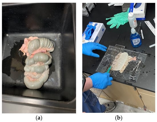 Specimen preparation: (a) colon extraction and (b) colon tract slicing and flattening.