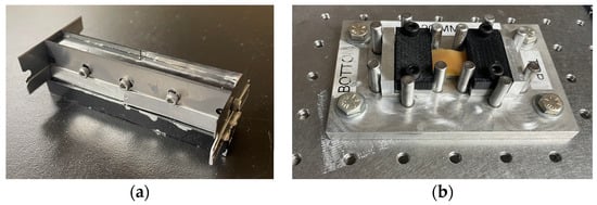 To avoid slippage of the specimens during testing, they were secured to a sacrificial 3D printed serrated pair of clamps on each end using 3M VetBond® (Saint Paul, MN, USA) surgical glue. Specimens and clamps were assembled in a custom jig with cylinders guiding the clamps’ placement (Figure 2b). A plateau supported the specimen free length to avoid sagging during specimen preparation. The nominal gage length and width of the specimens were 20 and 10 mm, respectively. The length, width, and thickness of each specimen were measured across the top, middle, and bottom before testing. Specimens were also weighed.