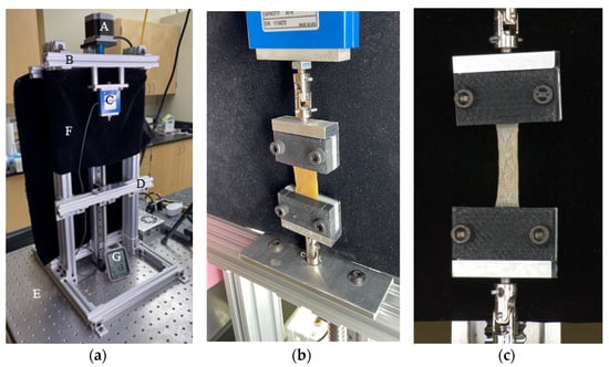 Uniaxial testing machine. (a) Components: A. stepper motor; B. fixed frame; C. load cell; D. moving frame; E. optical table; F. black curtain; G. environmental monitor. (b) A specimen under loading with universal joints connected to the clamps. (c) View from the camera. Table 1 includes the specimens’ dimensions.