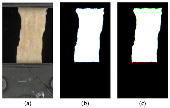 Monitoring the changes in elongation and width of the specimens during uniaxial testing. (a) Original image. (b) Black and white equivalent image; boundaries were identified. (c) Black and white equivalent image with the four boundaries separated into four regions.