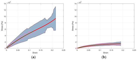 Average and standard deviations of the engineering stress–strain curves: (a) circumferential direction and (b) longitudinal direction.