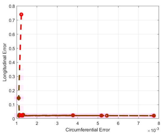 Using the Genetic Algorithm (GA) Toolbox within Matlab® (R2022a) a Pareto front for the two objective functions was generated. As expected, the extremes of the Pareto front corresponded to negligible errors in one direction and large errors in the other. A cluster of points in the lower left corner of the Pareto front corresponded to acceptable solutions (Figure 8). Figure 9 shows various results of the Pareto front while Figure 9a,b show solutions in which a good stress–strain representation of either the circumferential or longitudinal directions led to large errors in the other direction. Figure 9c is a case with the most balanced circumferential and longitudinal errors. Table 3 lists the coefficients corresponding to this case. Statistical analysis (circumferential, R2 = 0.9968; longitudinal, R2 = 0.9675) indicated that the model’s coefficients represented the experimental data accurately by accounting for the hyperelasticity of the tissues while accounting for the different strengthening effects of the fibers oriented in multiple directions.